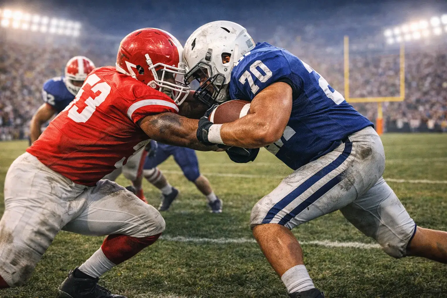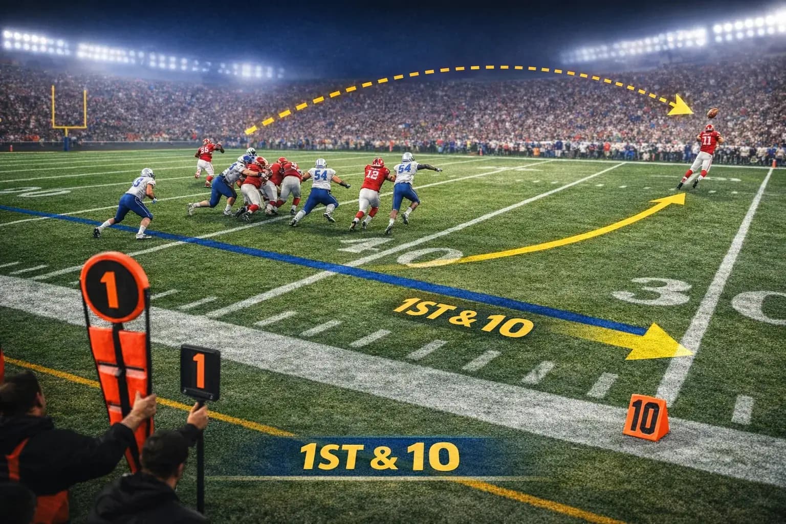 - Une équipe en défense cherche à stopper l’action : plaquage, passe défendue, interception (prise de balle sur une passe), ou récupération d’un fumble (balle échappée).